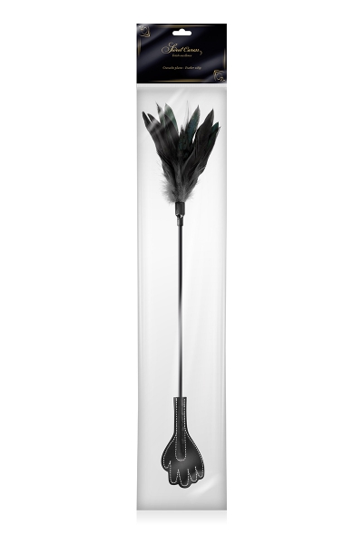 A l'autre extrémité de la cravache, la finition en plumes noires, très douce, permettra de caresser et de récompenser le (la) partenaire qui a fait preuve d’obéissance.