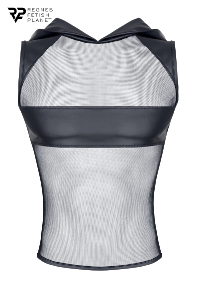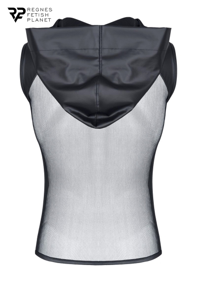 T-shirt fabriqué en fine résille avec capuche en wetlook, décoré d’une large bande noire au niveau du torse et des épaules. Ce t-shirt sans manche est fabriqué en Europe par la marque Regnes Fetish Planet.